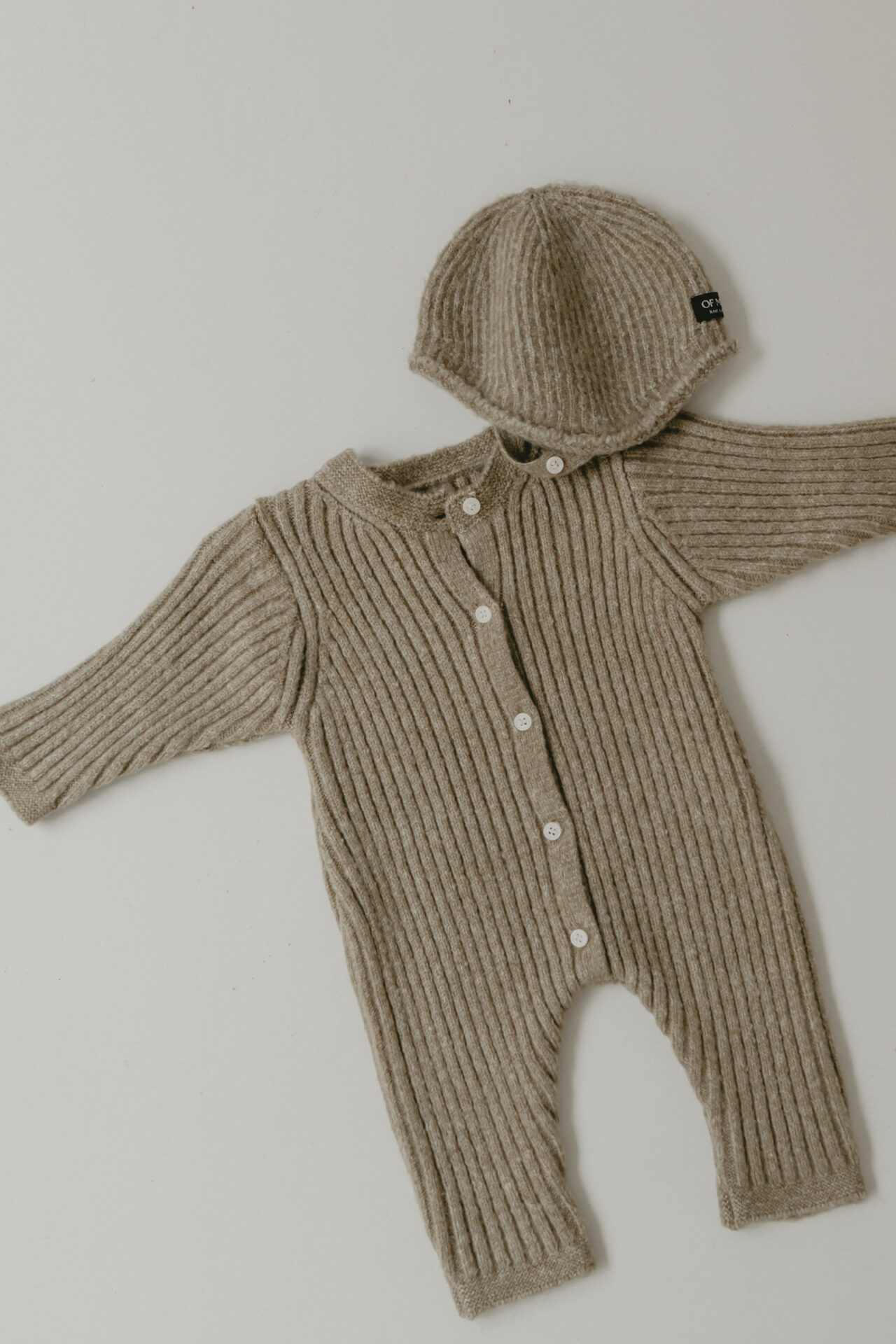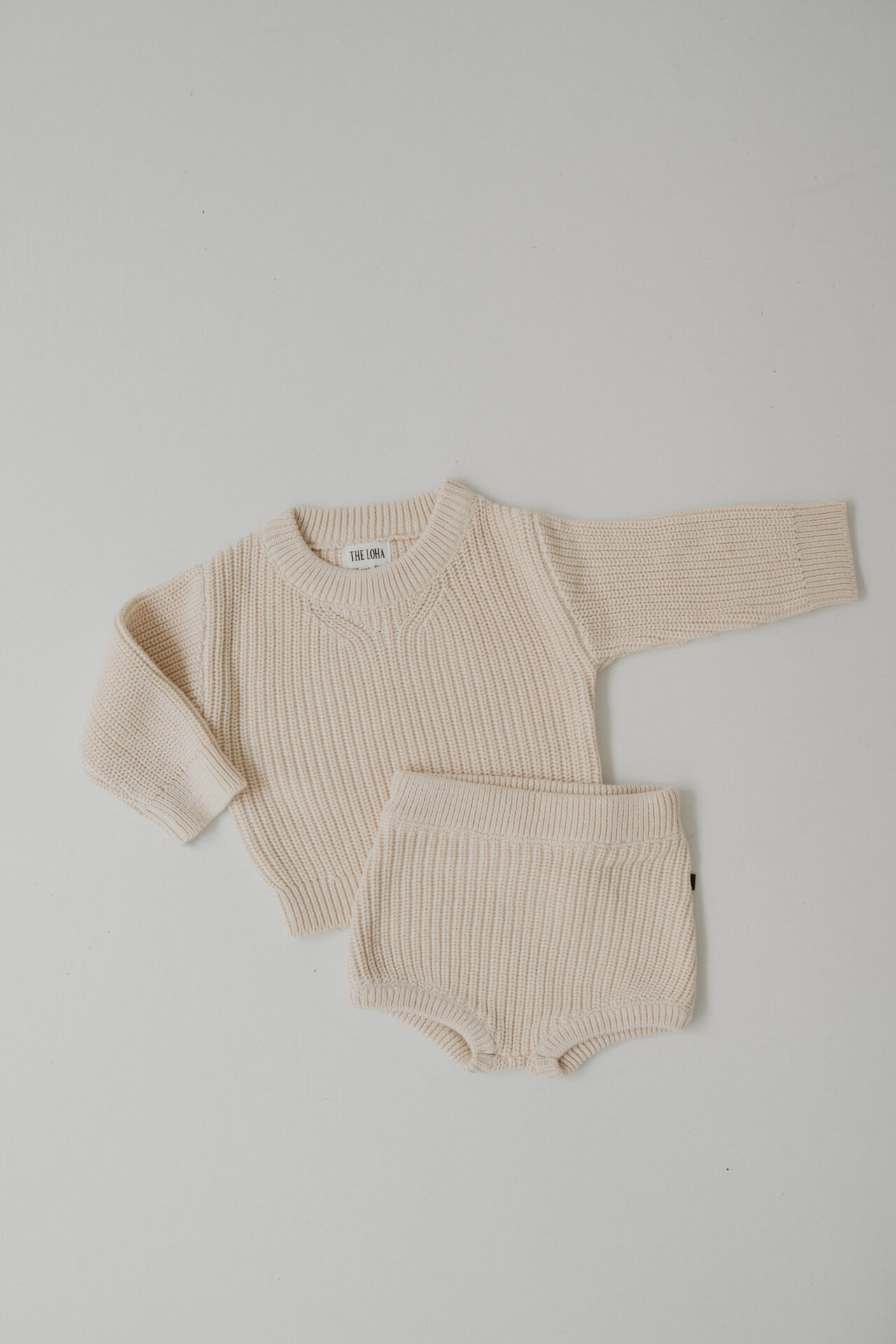 やわらかなニット素材が心地よい、温かみのあるセットアップです。 下はブルマなので、赤ちゃんらしい肌の質感も感じられます。