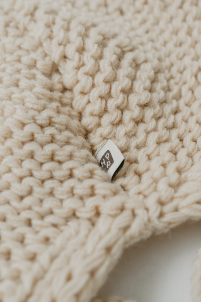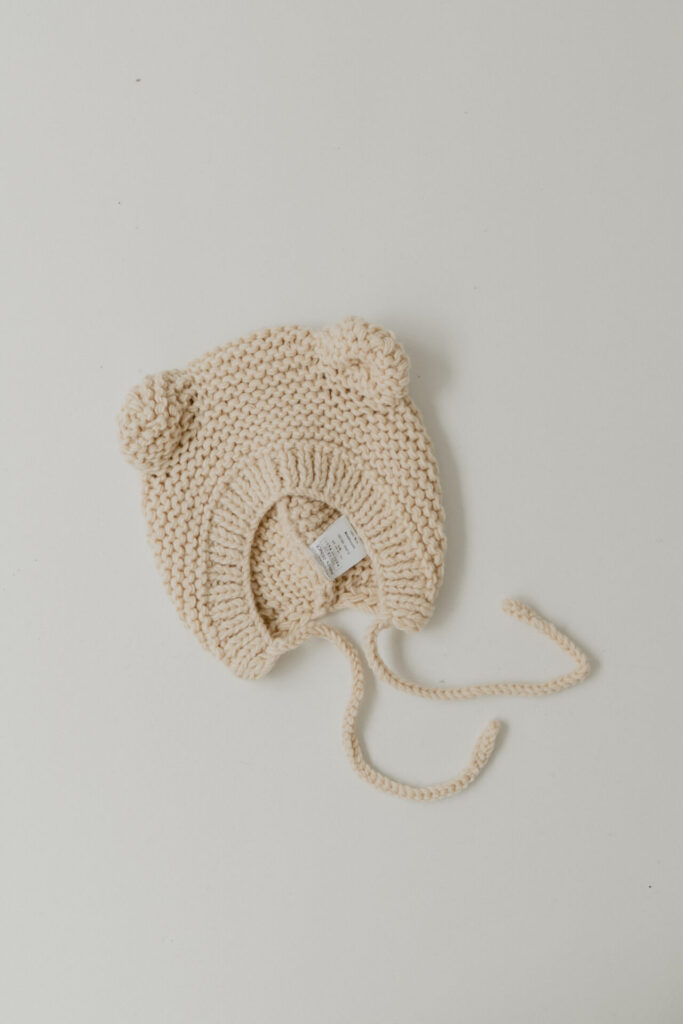 もこもこニットとくまみみデザインのボンネット。