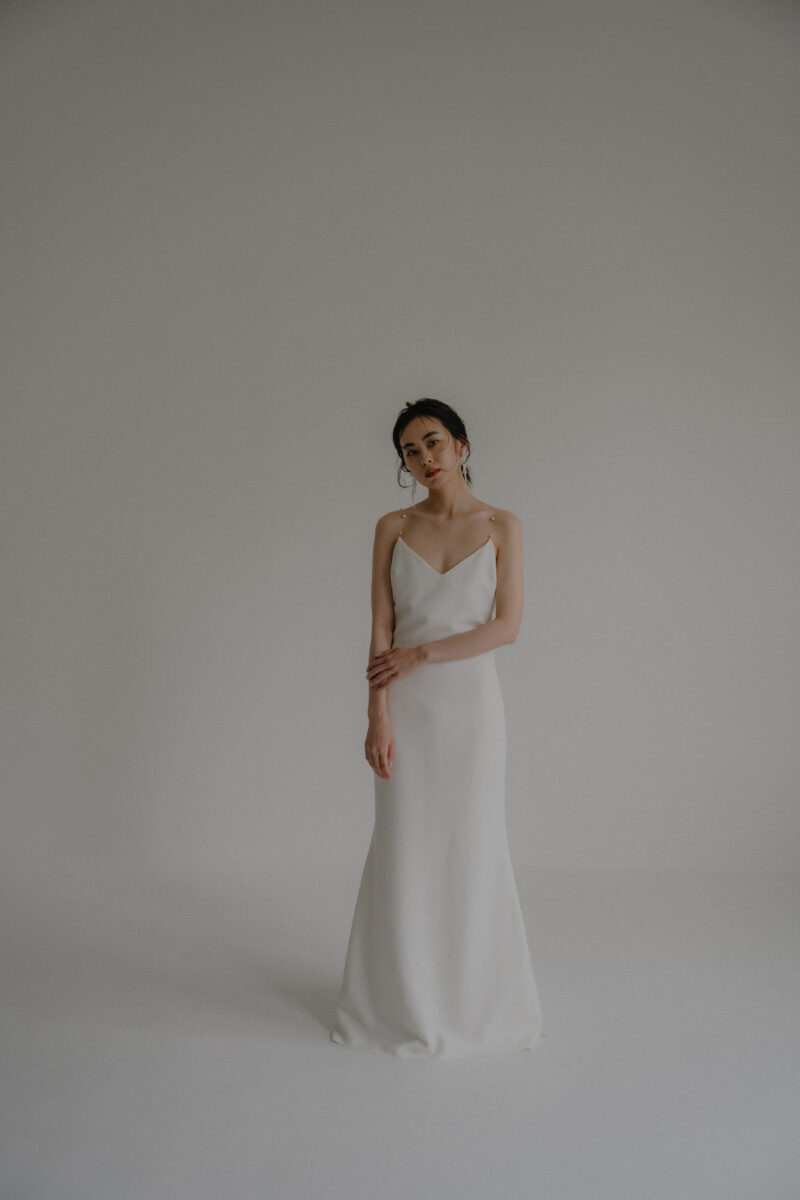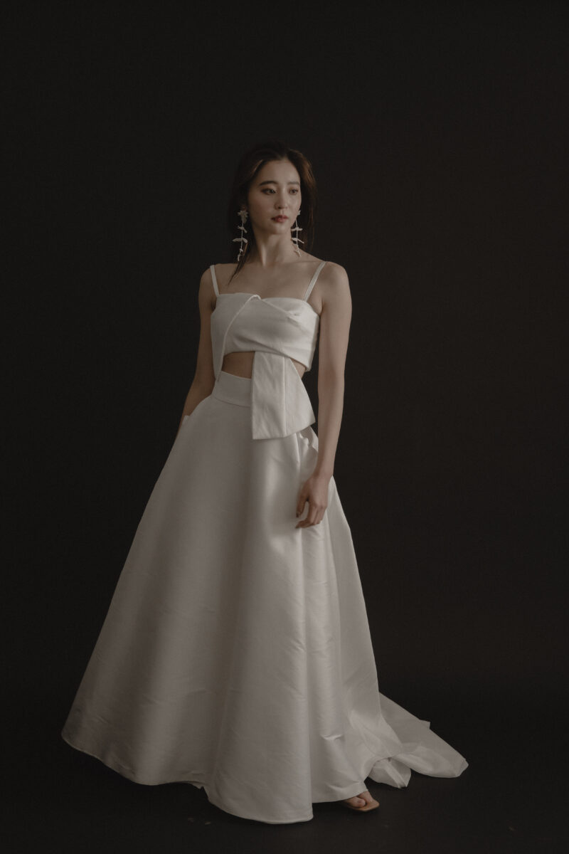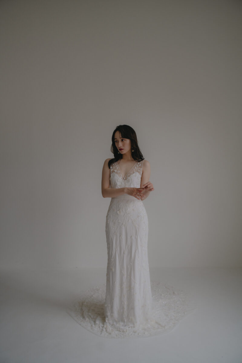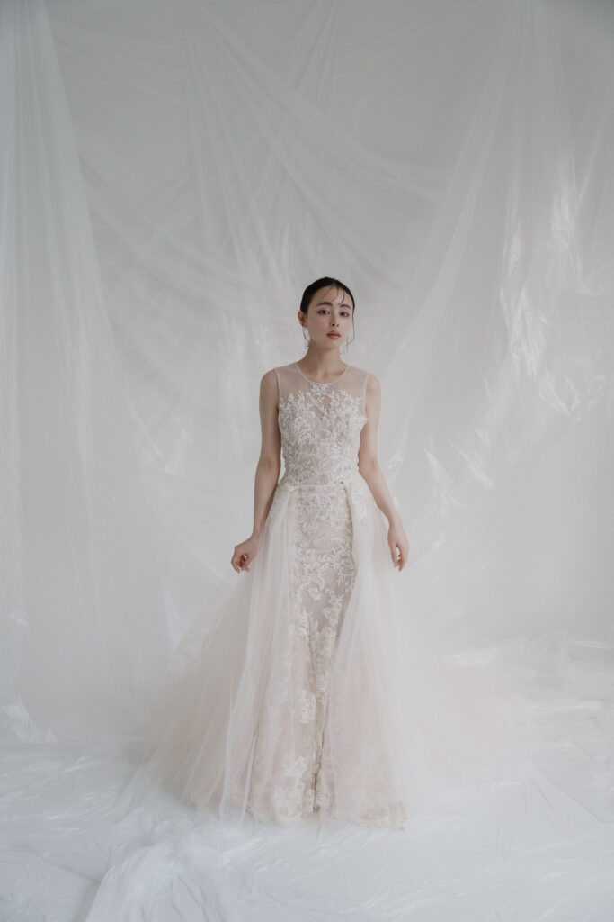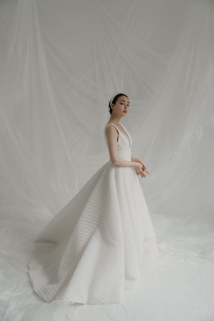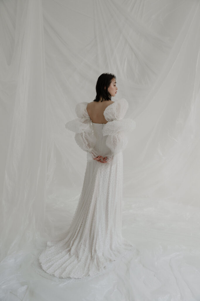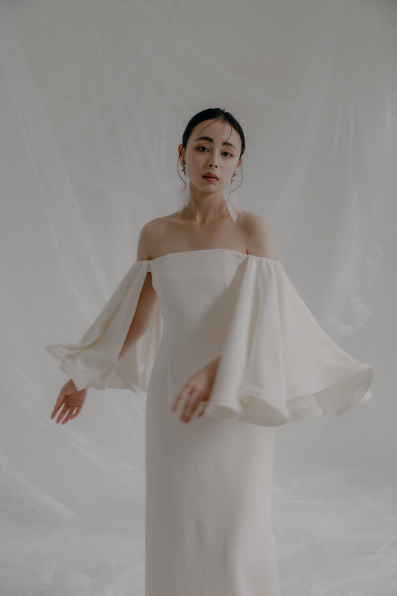 She has an atelier in Los Angeles, and while keeping up with trends, her modern, street style is extremely popular with brides around the world. The simplicity is packed with attention to detail, and you will fall in love with the luxurious details and textures. The off-the-shoulder fit and circular sleeves that flare out into a trumpet shape are unique, creating a variety of silhouettes as you move.