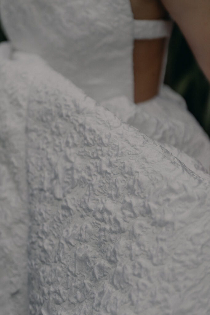 純白のドレスに刻まれた繊細な花柄は森の緑と調和し、自然の中でこそ映える上質な存在感を放ちます。