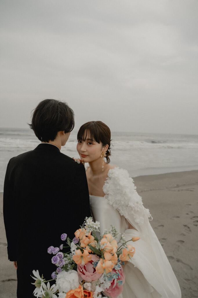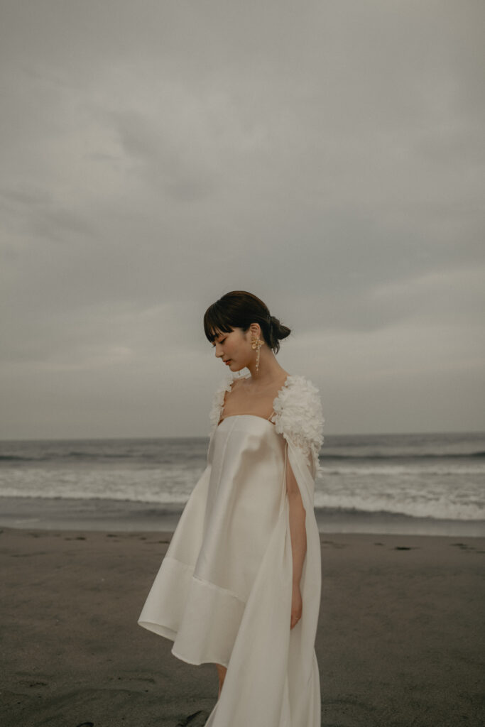 Style 02:波しぶきと戯れる、開放的なビーチコーデ。The LAWのミニドレスに重ねたFleur Capeは、潮風に舞うようなフォルムが魅力。肩元の立体的なフラワーモチーフとクリーンなラインのコントラストが新鮮。ぱっつん前髪のすっきりとしたヘアスタイルで、凛とした花嫁らしさを表現。