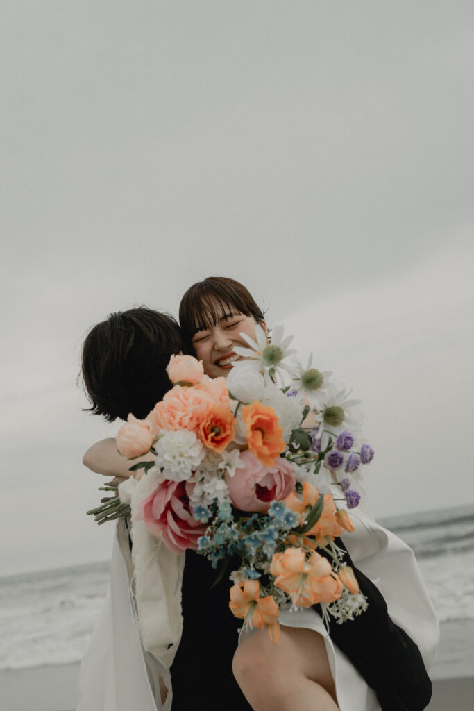 サマーシーズンを彩る鮮やかなオレンジを主役に、パープル・ブルー・ピンクと夏の陽気を感じるカラフルな花々を贅沢にミックス。シースルーリボンをあしらい、軽やかな動きのあるブーケデザインに仕上げています。