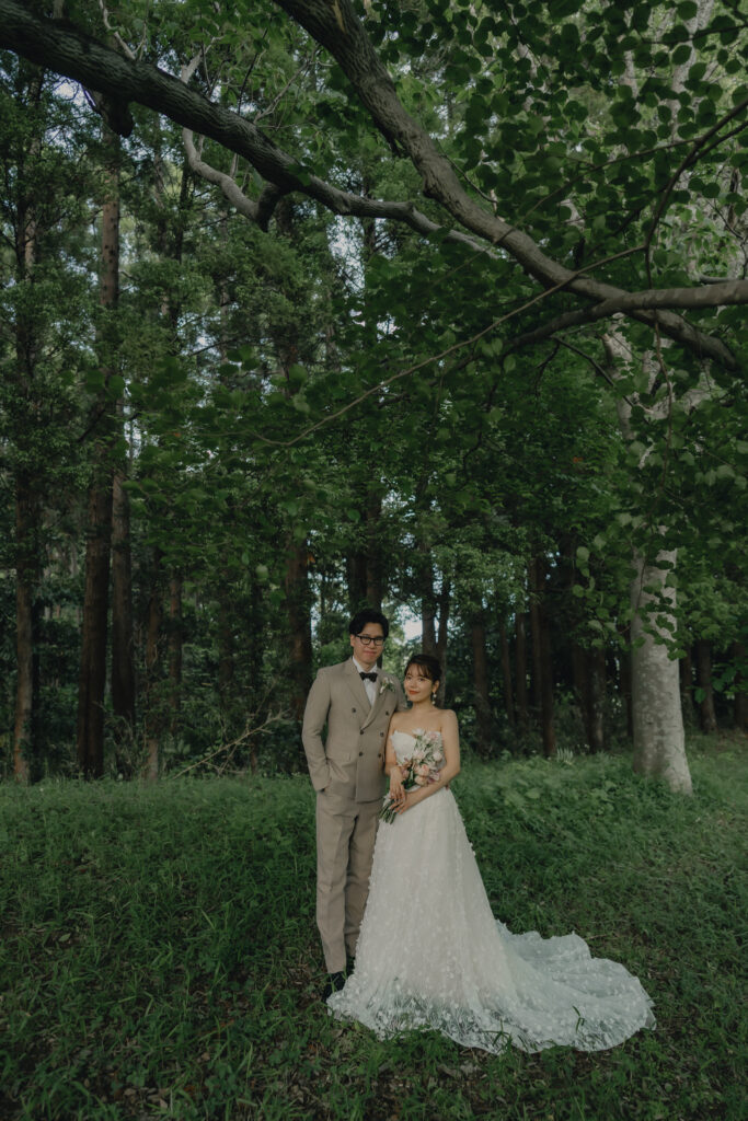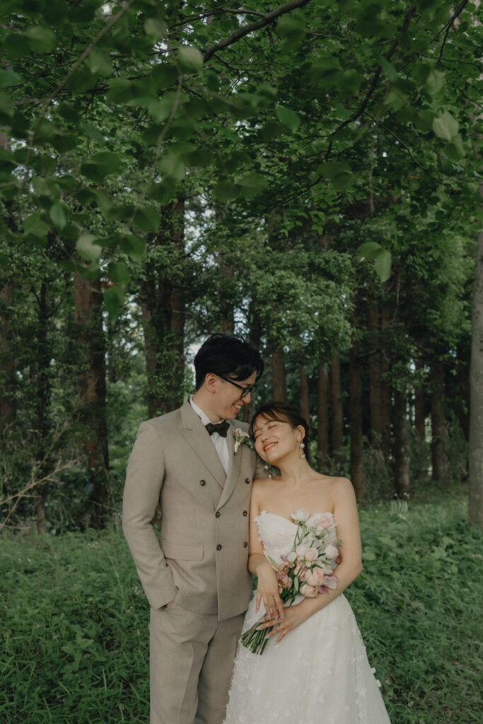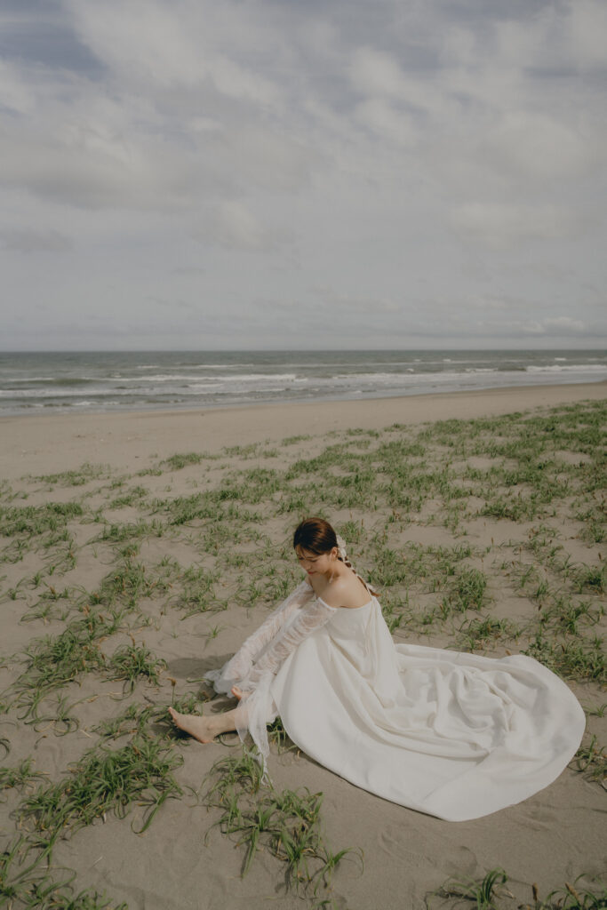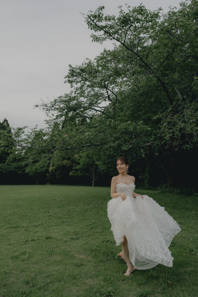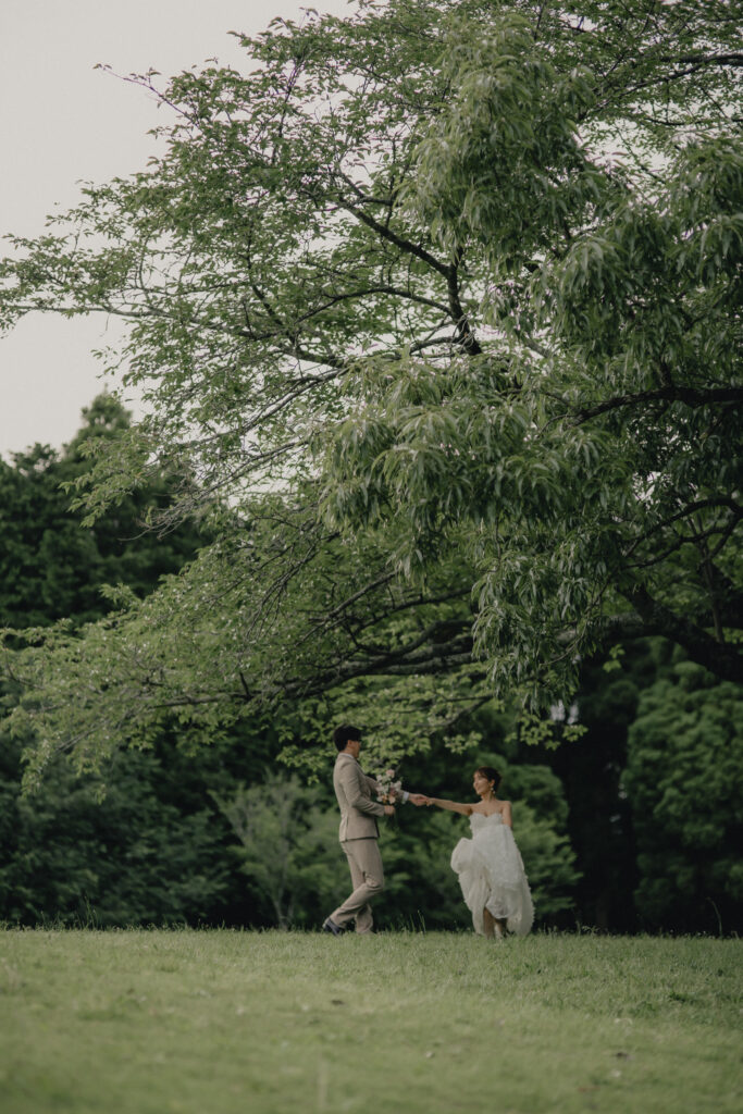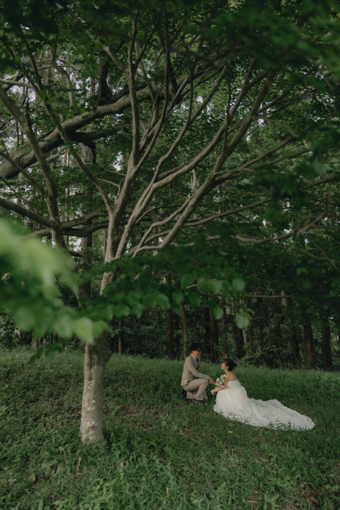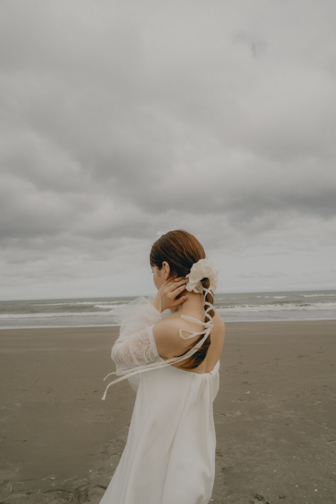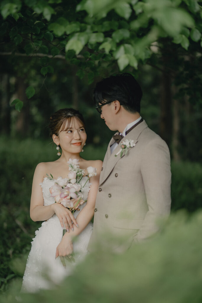 どこまでも続く長い砂浜から緑が深まる森林公園へ。2つのロケーションを踊るように巡りながら撮影が進みました。纏うドレスと共にふたりの表情もより開放的に変化し、その場所ごとに生まれる物語を紡いでいくように2人にとって特別な時間を重ねていきます。