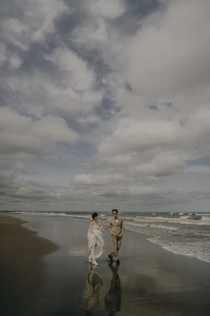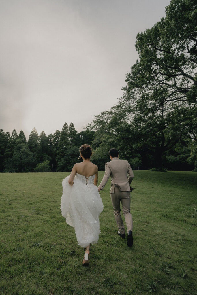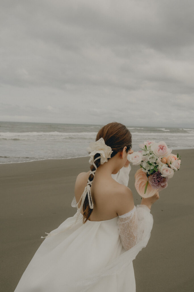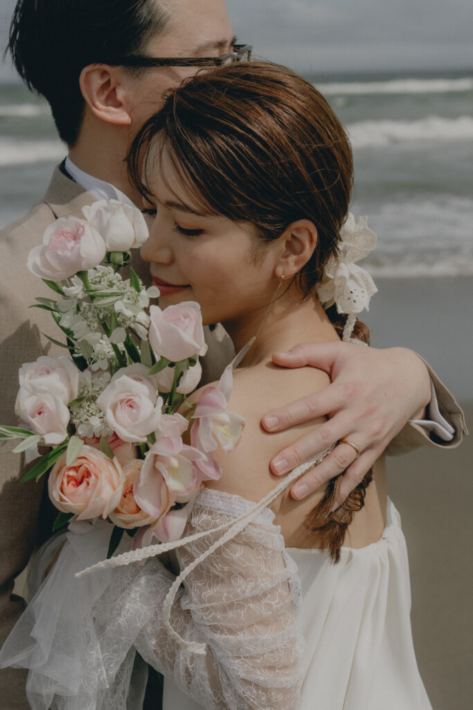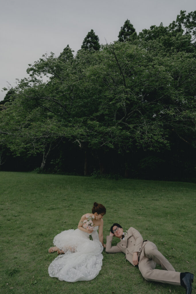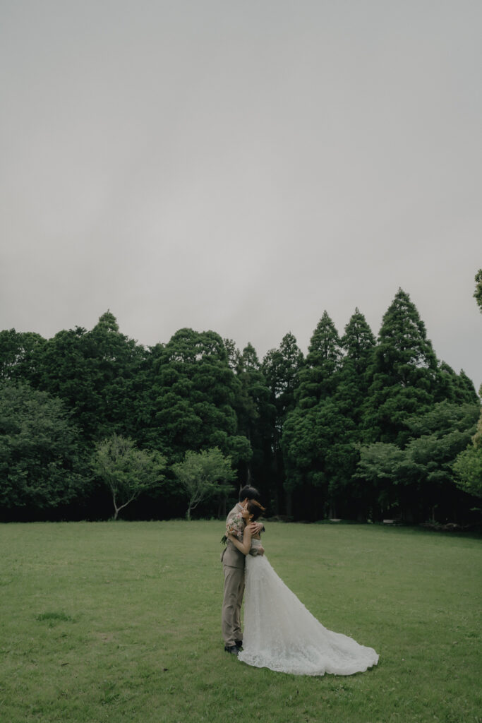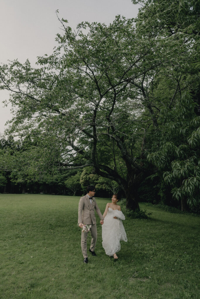 どこまでも続く長い砂浜から緑が深まる森林公園へ。2つのロケーションを踊るように巡りながら撮影が進みました。纏うドレスと共にふたりの表情もより開放的に変化し、その場所ごとに生まれる物語を紡いでいくように2人にとって特別な時間を重ねていきます。