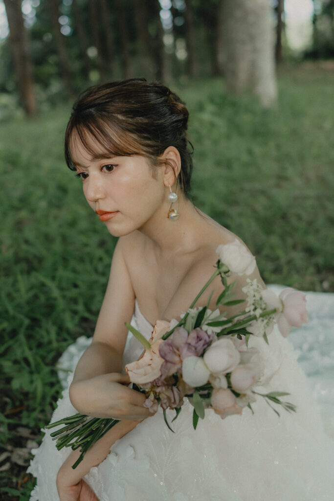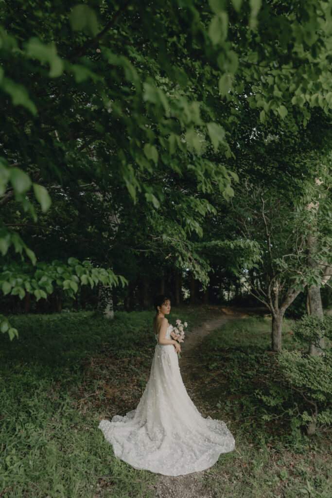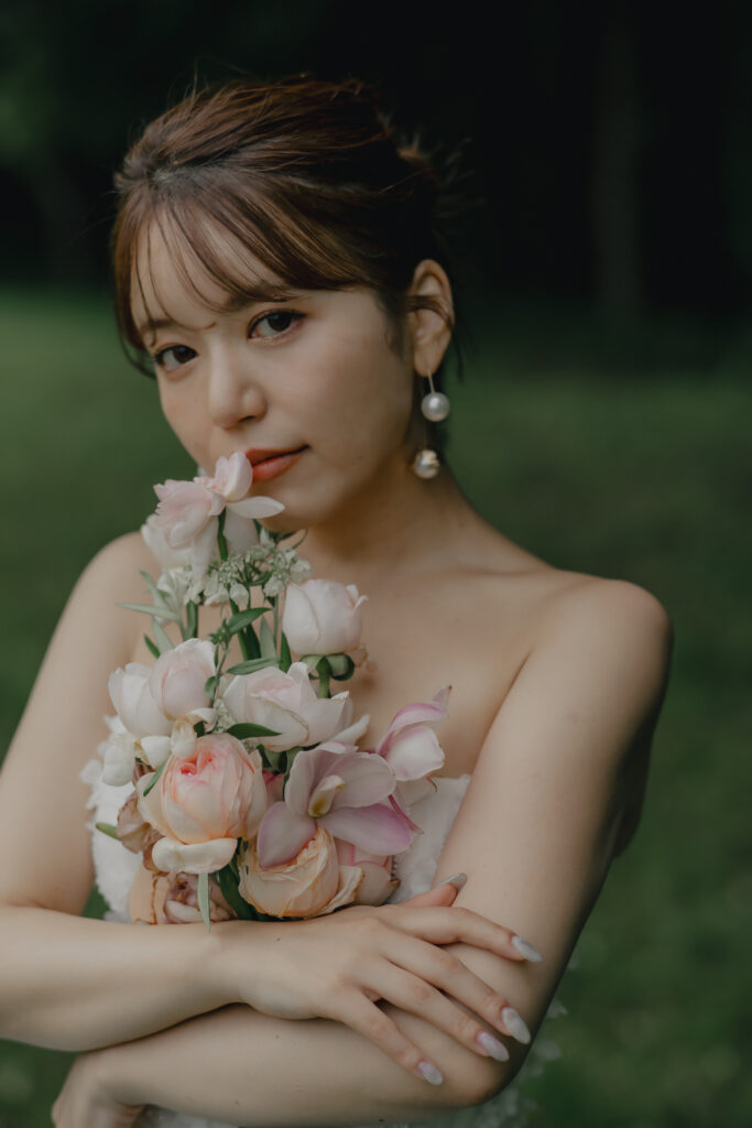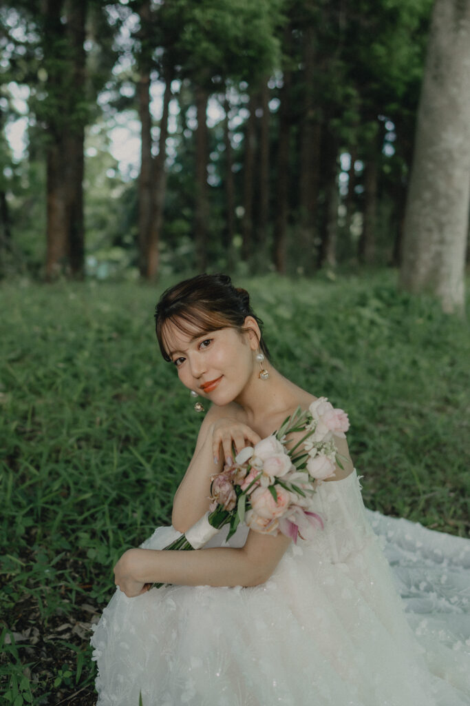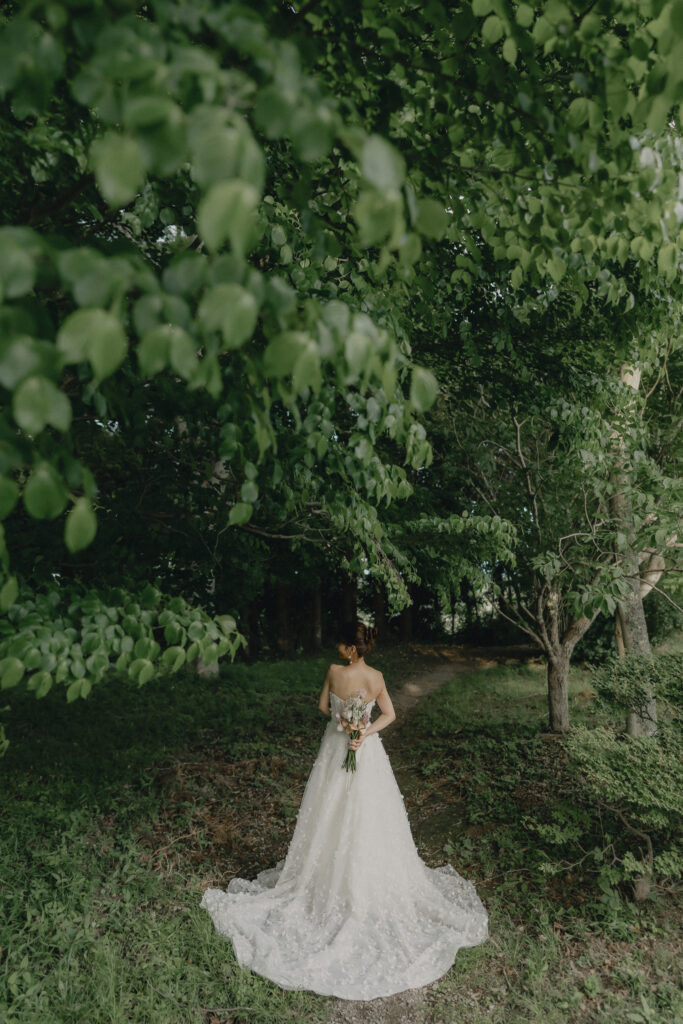 ADRIANA MADRIDのAlessiaは全身に施されたビジューが自然光にキラキラと輝き、撮影中も心踊るドレス。装飾デザインが草花のモチーフなので緑豊かなロケーションにも相性はピッタリです。ドレスの可憐さと花嫁が持つ愛らしい雰囲気をより引き立たせる優しい印象のブーケがスタイリングをさらに華やかに纏めます。