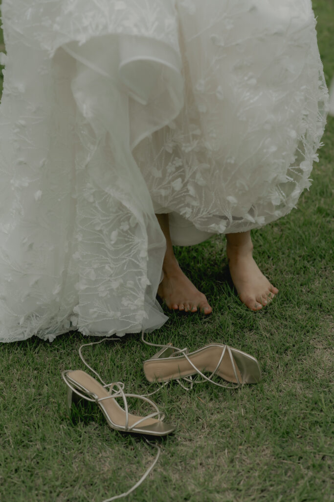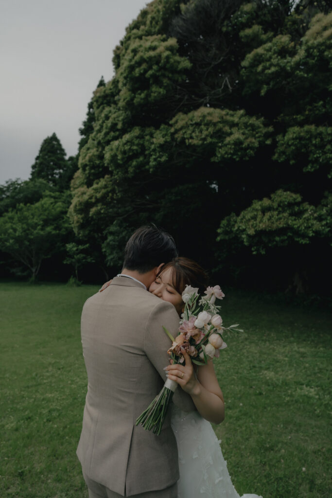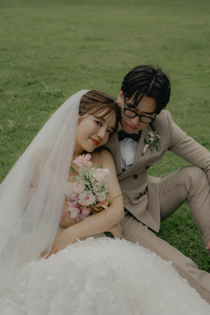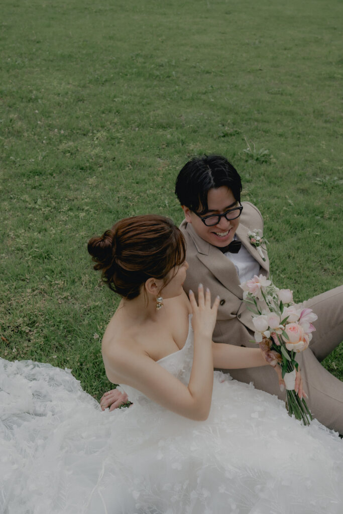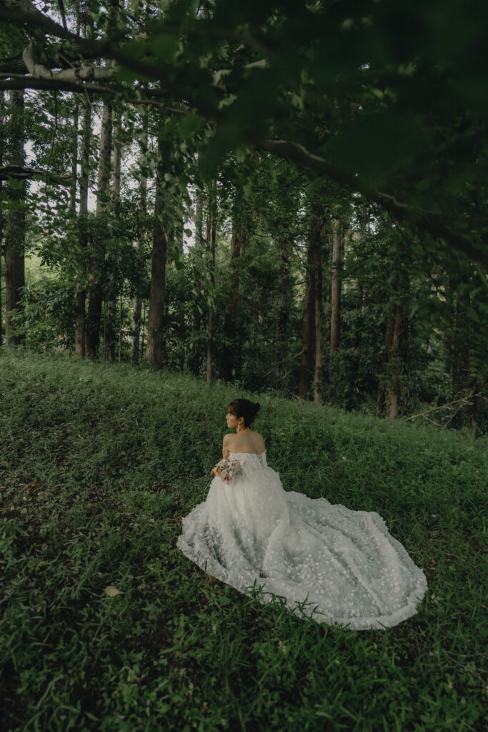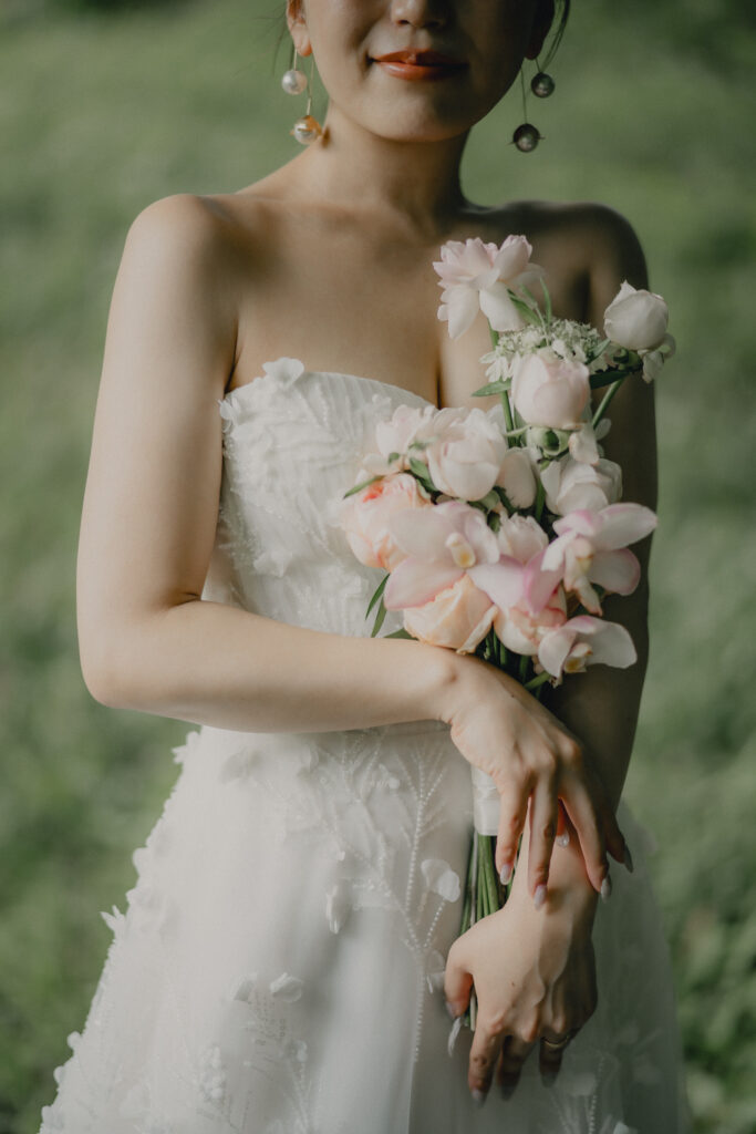 ADRIANA MADRIDのAlessiaは全身に施されたビジューが自然光にキラキラと輝き、撮影中も心踊るドレス。装飾デザインが草花のモチーフなので緑豊かなロケーションにも相性はピッタリです。ドレスの可憐さと花嫁が持つ愛らしい雰囲気をより引き立たせる優しい印象のブーケがスタイリングをさらに華やかに纏めます。