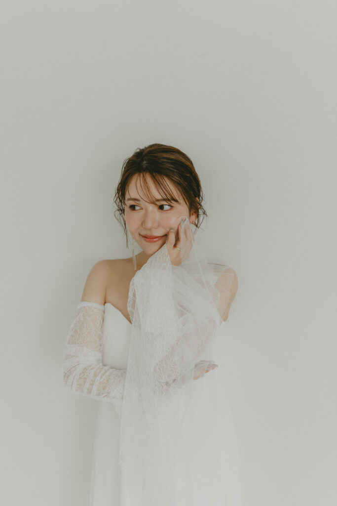 前髪は束感のあるシースルーにすることでで軽やかな印象に。メイクはツヤ感のある肌づくりで、優しい艶やかな表情を演出。