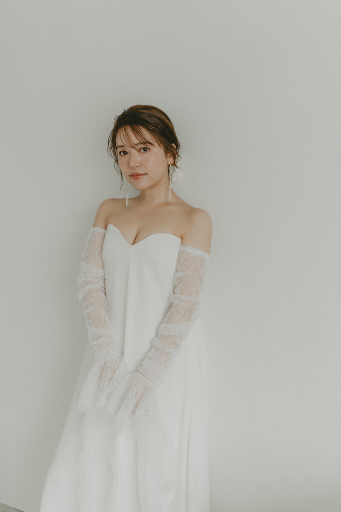 すっきりとしたハートネックラインで花嫁の佇まいを引き立てる一着です。今回ドレスと一緒に合わせたSÉBASTIEN LUKEの