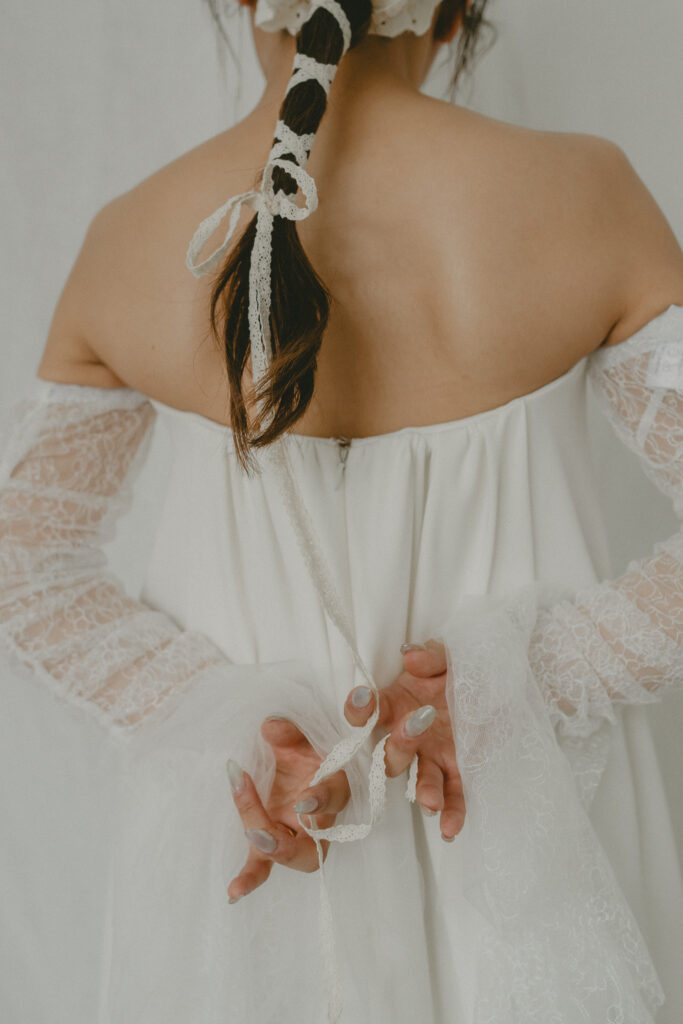 バックスタイルが編み上げのリボン使用でより可愛らしい印象を加速させます。