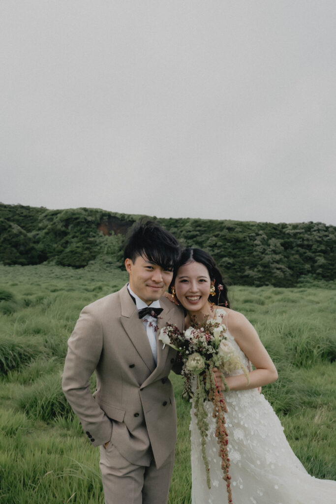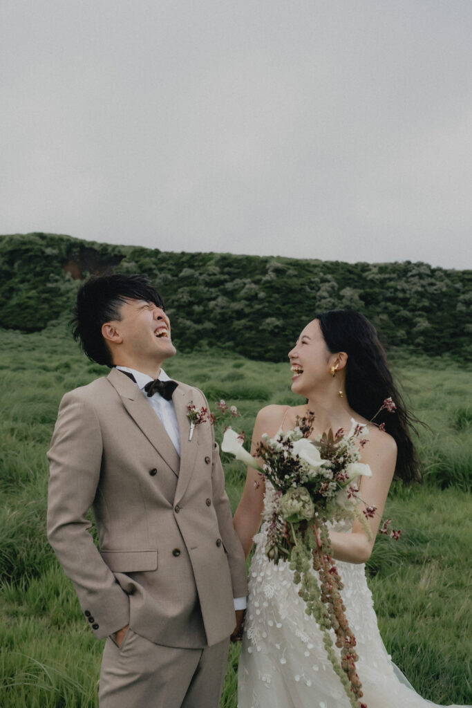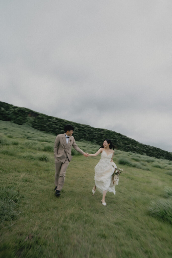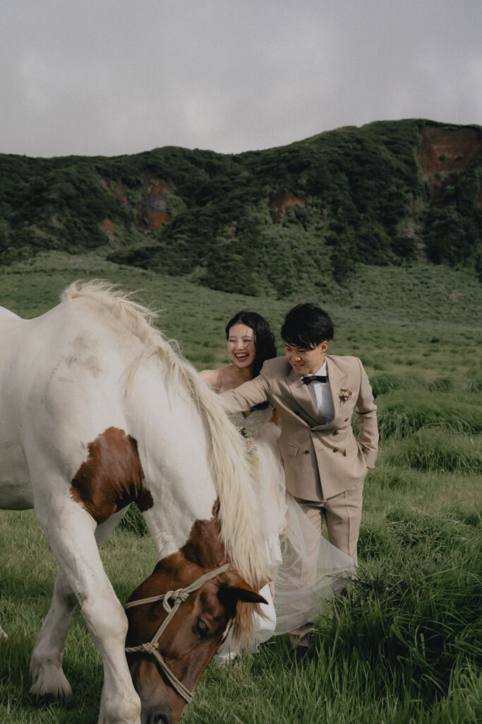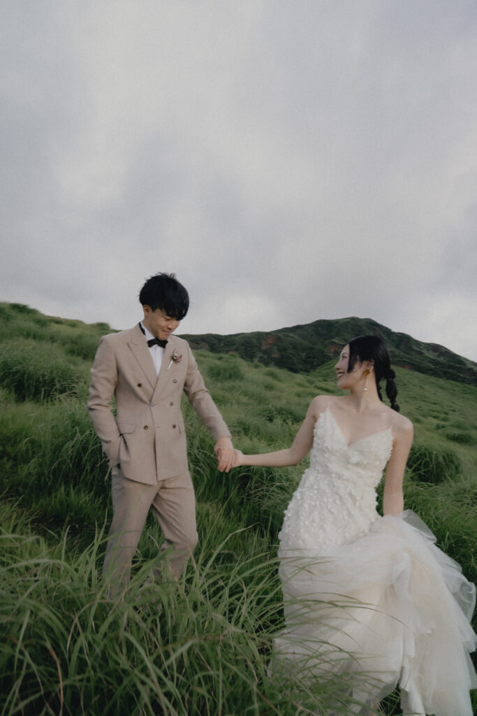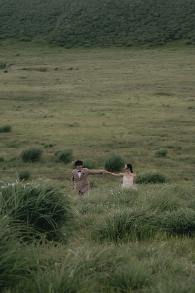 阿蘇の大きな空と緩やかに続く地形。その中を風に導かれるように歩きながら撮影した夏限定の阿蘇での撮影プラン。草原の向こうを渡る風や、ゆっくりと流れる雲に身を委ねていると、時間の進み方まで少し変わったように感じられます。撮影の途中で出会った馬の穏やかな佇まいも、この場所ならではの風景の一つ。手を取り合って進む姿や思わず溢れる笑顔が、阿蘇のスケール感や人と自然が近い距離で共存する空気と重なり、無理のない表情として自然と写真に映し出されていきました。