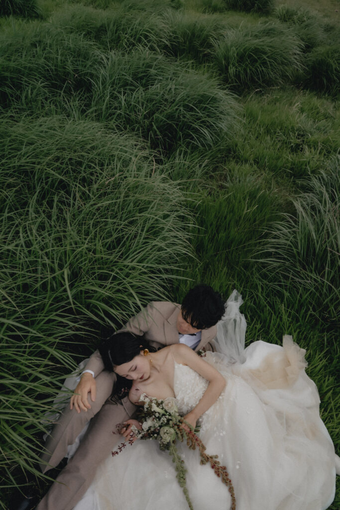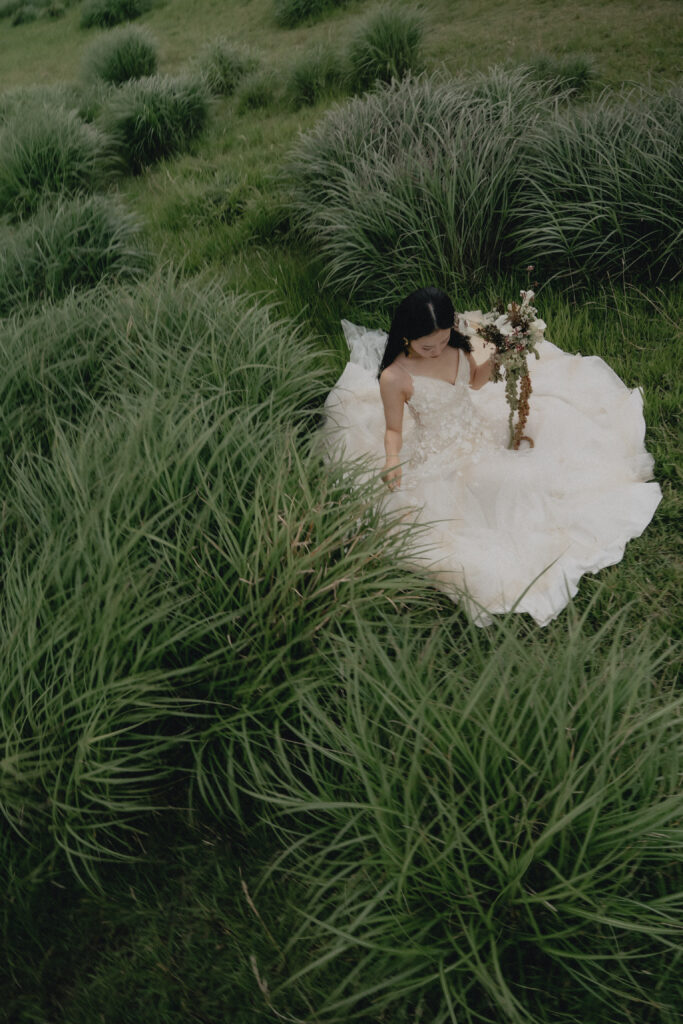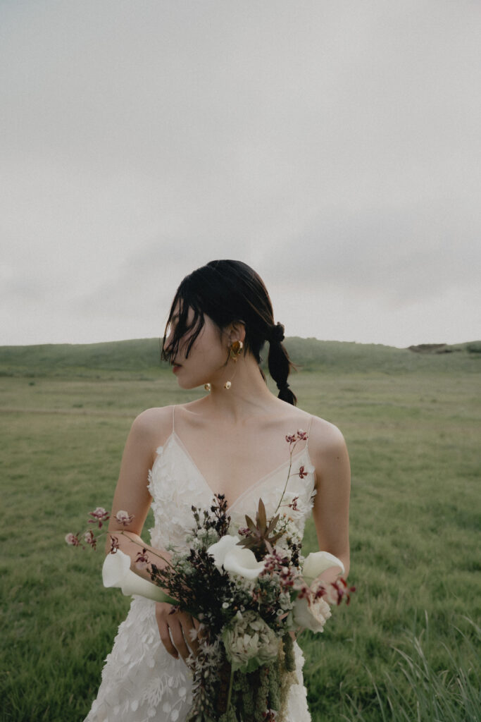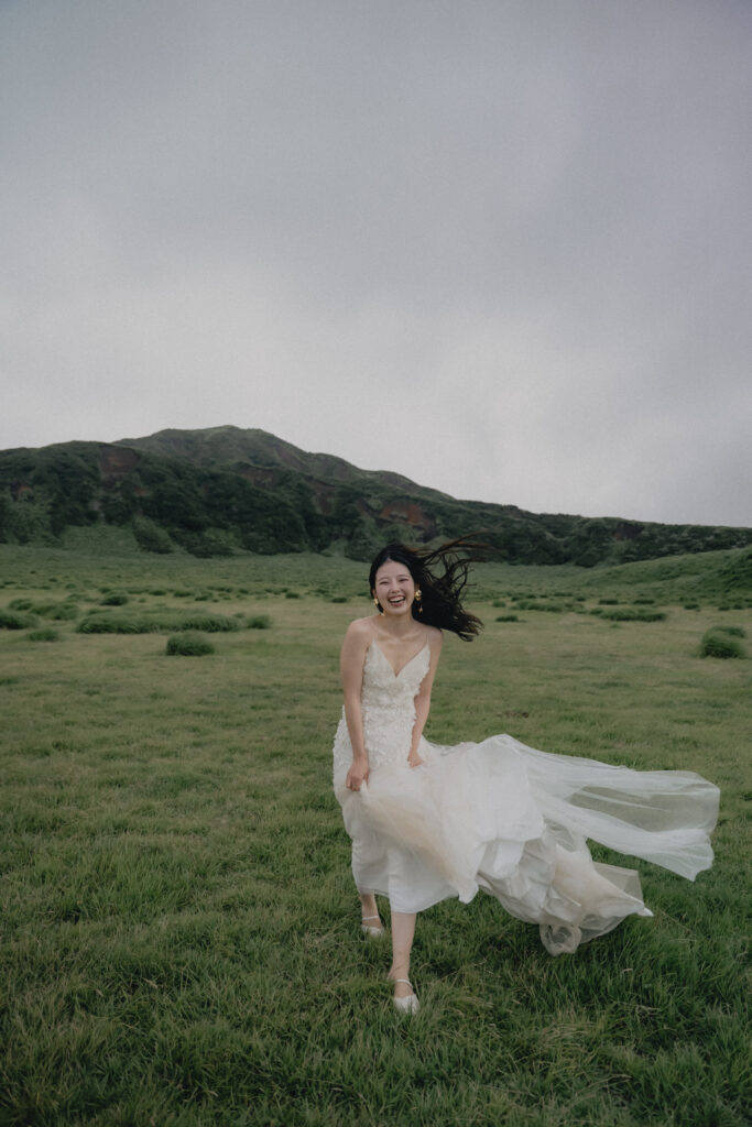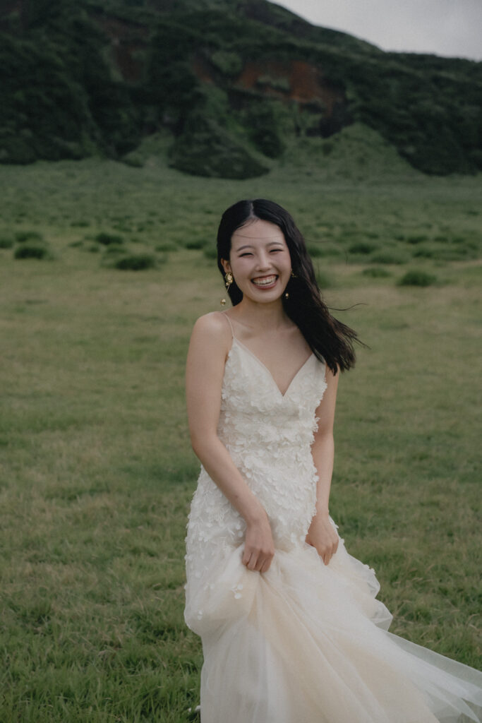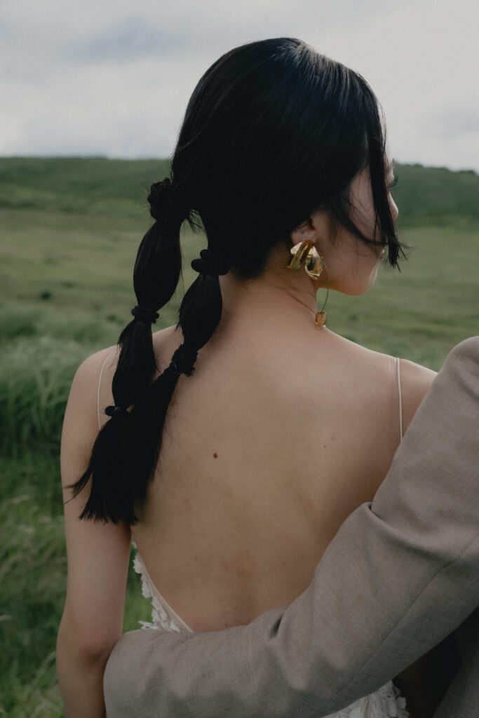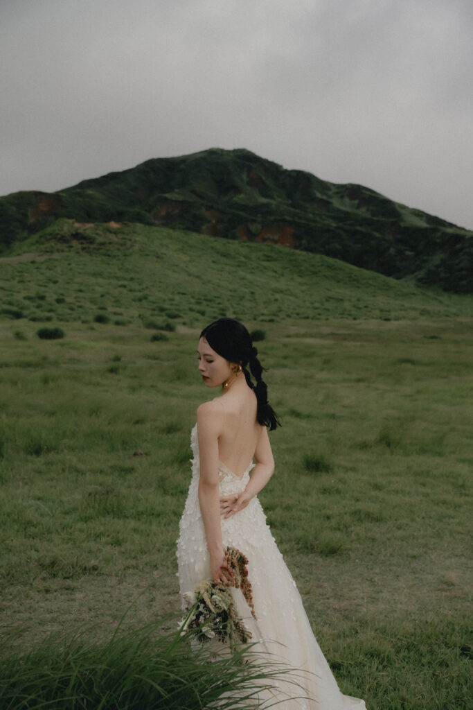 今回は1着のドレスをベースに、ヘアスタイルを2パターンに変えながら同じ装いの中で生まれる表情や空気感の違いを切り取りました。風や光、その時々の動きに身を任せることで、作り込みすぎない自然体のウェディングスタイルが浮かび上がってきます。風を受けて揺れるシルエットや、地形に沿って進むたびに変わっていく表情もこのドレスならではの魅力の一つ。主張しすぎることなく、それでいて存在感を失わない佇まいが阿蘇の自然の中でキラリと際立っていました。