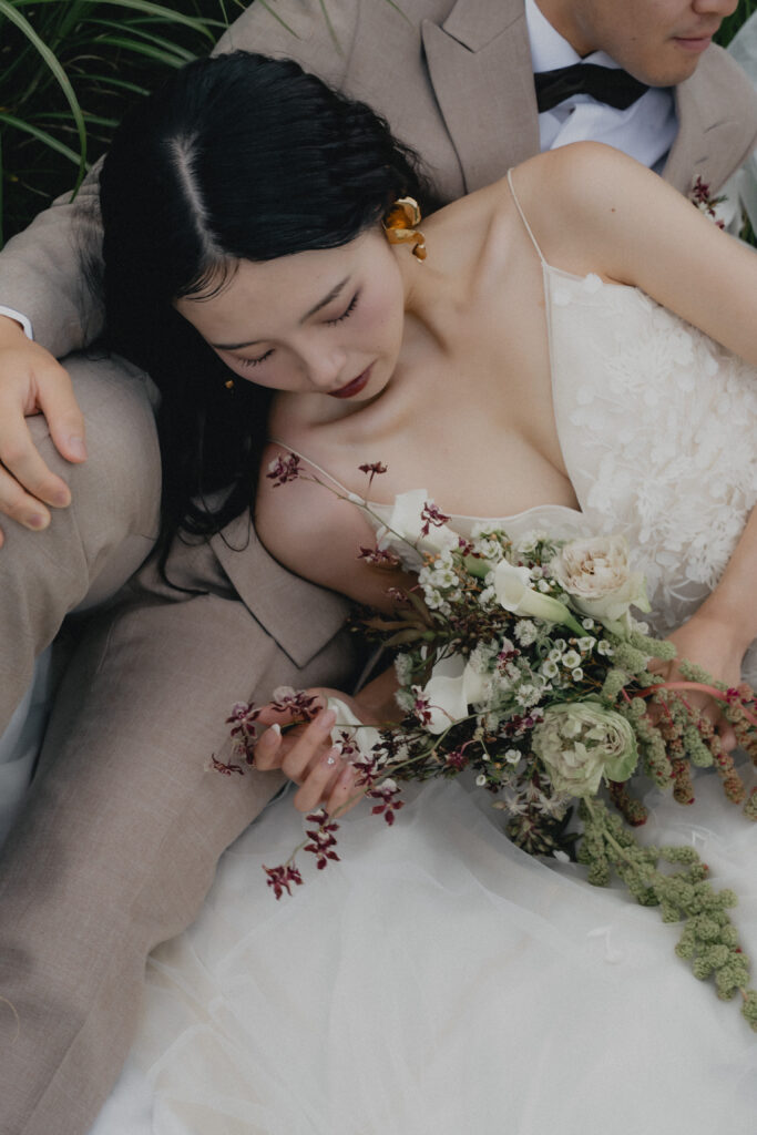ホワイトとグリーンをベースにダークトーンの花材を織り交ぜた縦長シルエットのブーケ。一見ナチュラルでありながらも花の重なりや流れにしっかりとしたリズムを持たせ、スタイリング全体に奥行きとモードなニュアンスを添えてくれます。