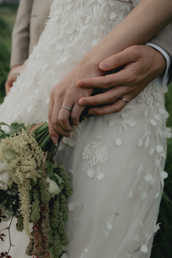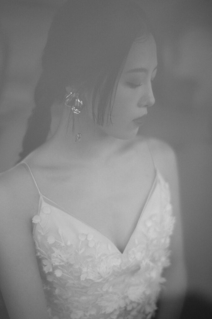 ひとくせ加えたローポニーで、全体のムード少し引き締めたスタイルにチェンジ。顔周りのカットラインを活かしながら、風を受けたときにやわらかく動いて花嫁の豊かな表情に寄り添えるようにしました。