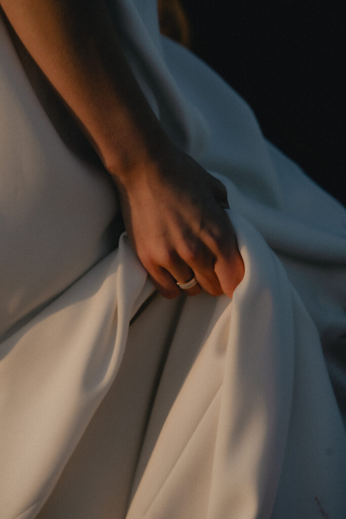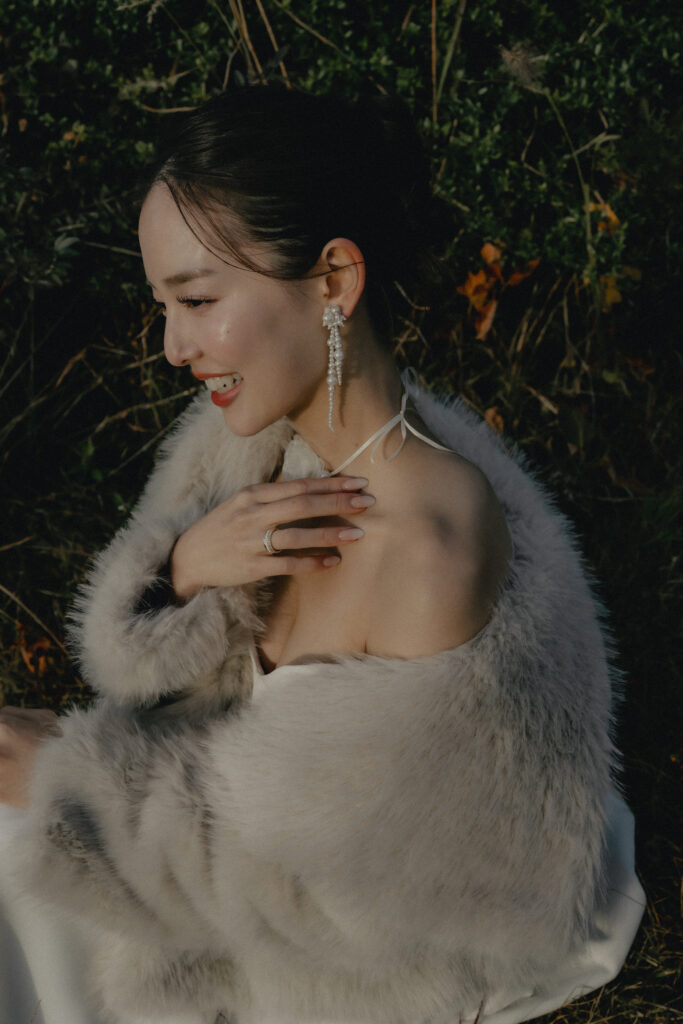 シンプルで余白のあるドレープが綺麗なbesaのROWENをベースに、夕日の光を美しく受け止めて高級感を感じさせるスタイリングに。動きに合わせて揺れるやわらかな素材感とボディラインを拾いすぎないシルエットが、自然の中でも軽やかに馴染みます。アクセントとして取り入れたファーコートは秋らしい温もりをプラスしながら、光に奥行きと立体感を生み出すポイントに。ヘアはすっきりとまとめ、首元やデコルテを引き立てることで抜け感と女性らしさをバランスよく演出しました。
