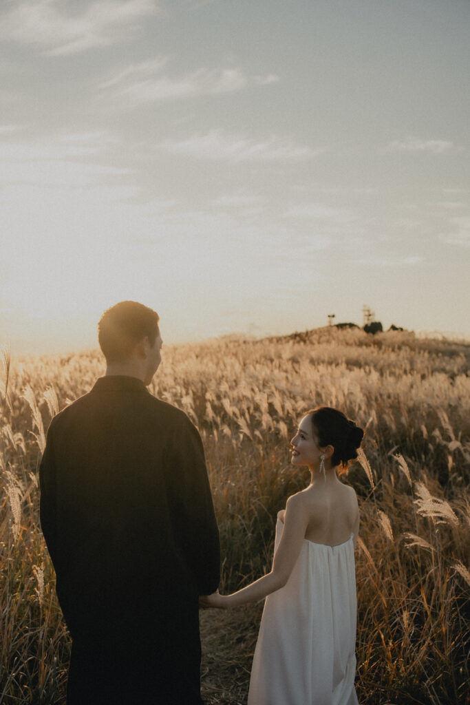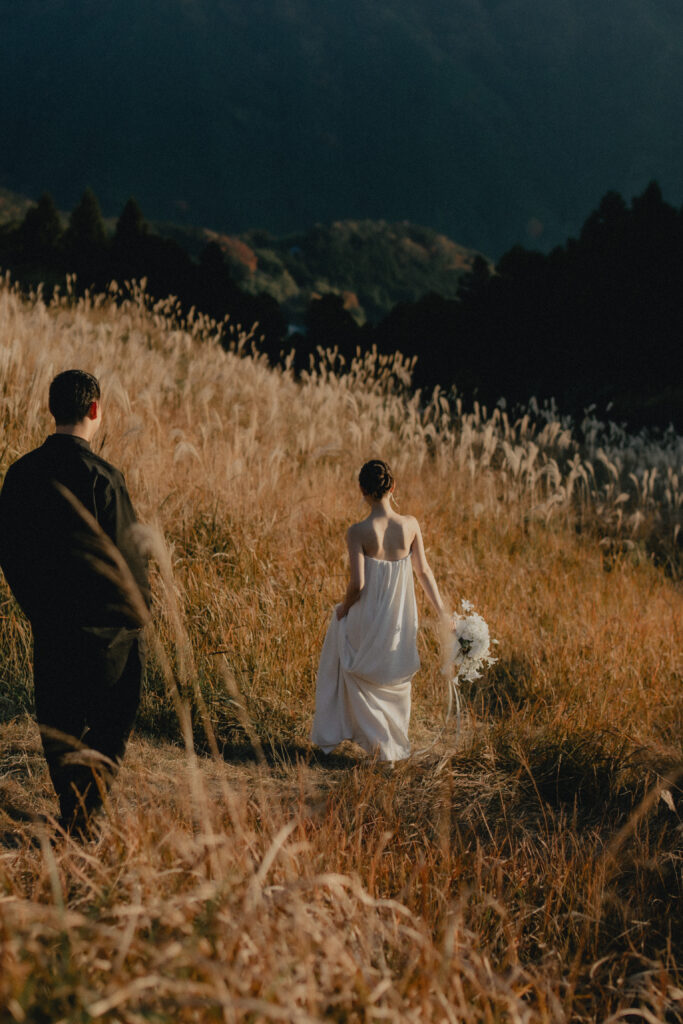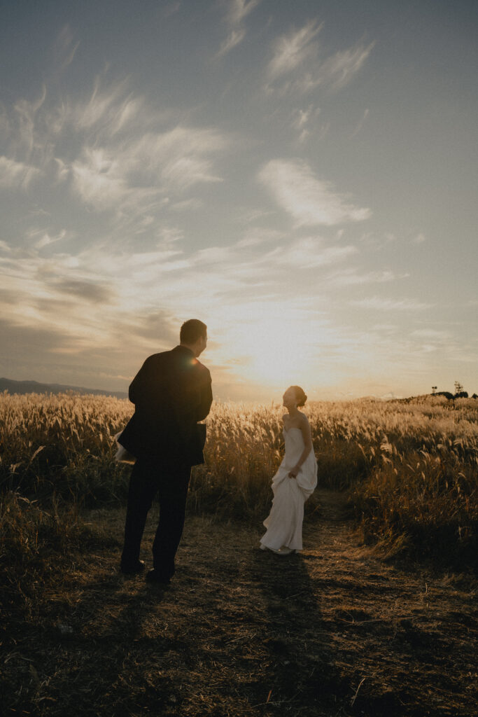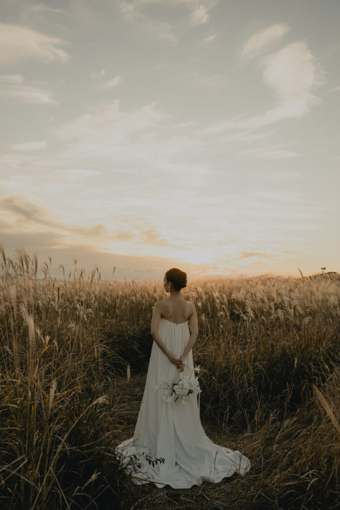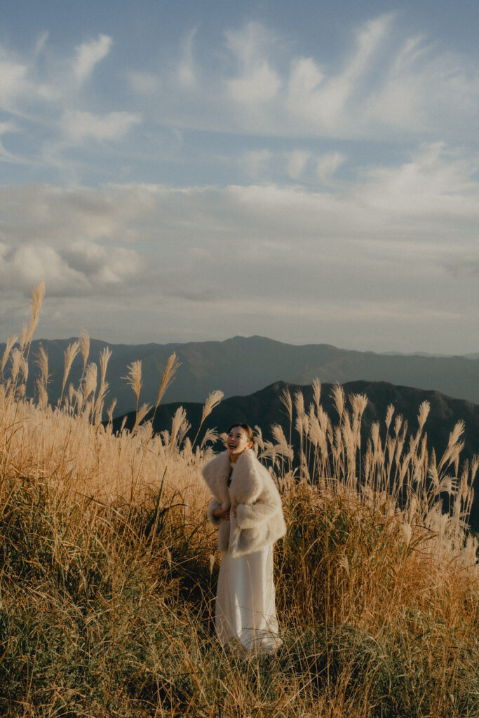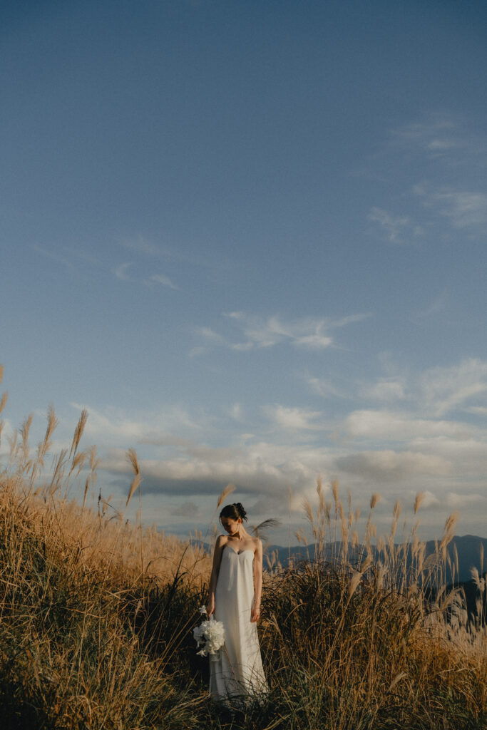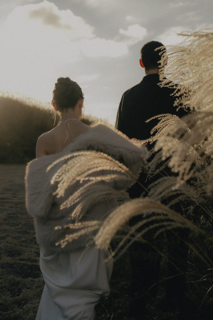 11月・和歌山の生石高原に広がる、秋のススキ野原。夕日がゆっくりと沈んでいく時間に合わせて撮影を行いました。一面に広がるやわらかな光と風に揺れるススキ。その中に佇むふたりの姿はまるで景色の一部のように自然に溶け込んでいきます。時間の移ろいとともに変化する光を感じながら、その一瞬一瞬をたいせつに切り取った秋のロケーション撮影となりました。