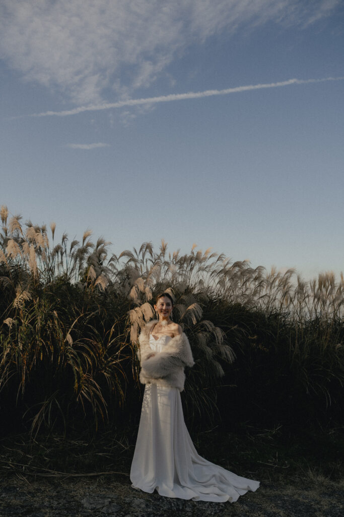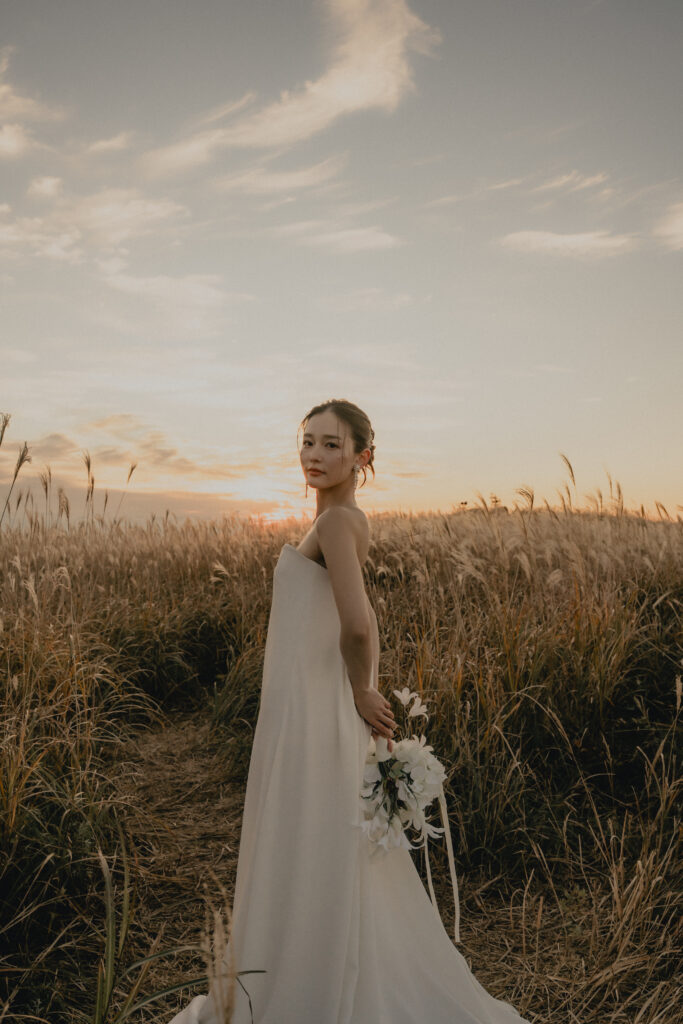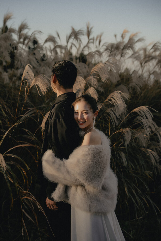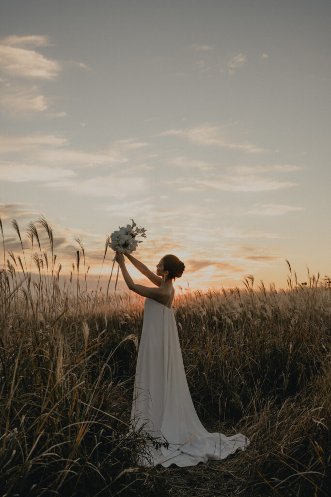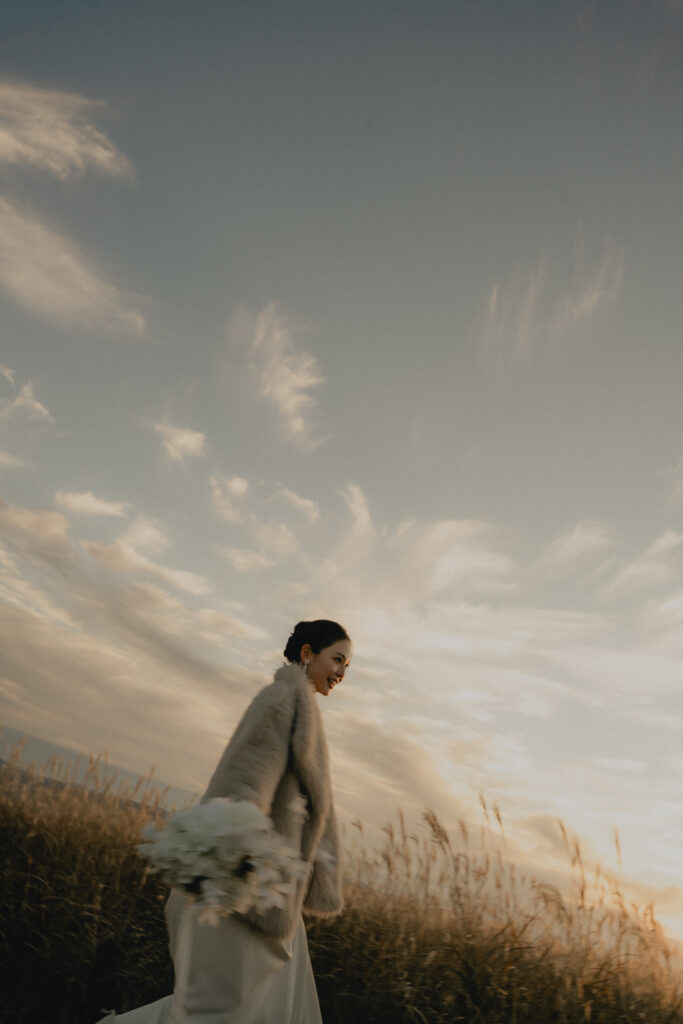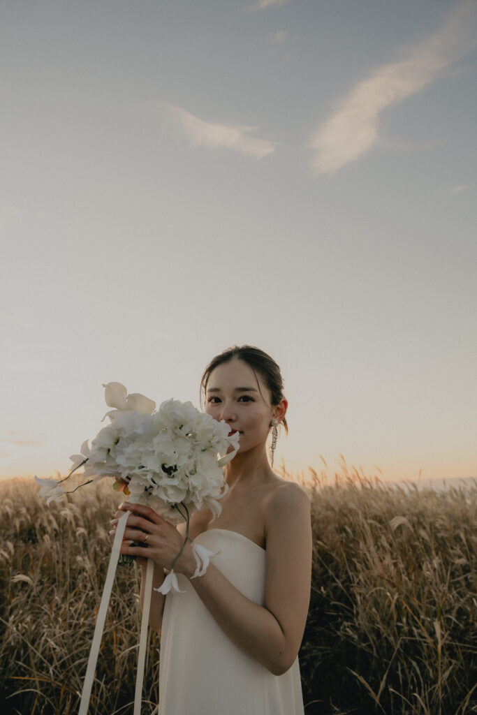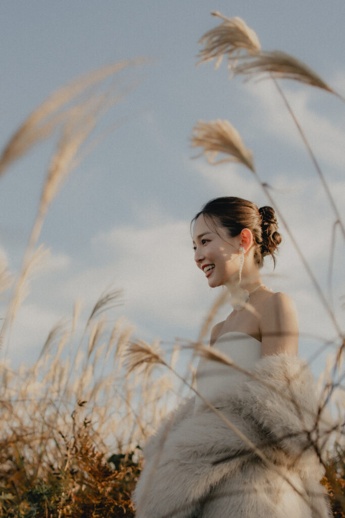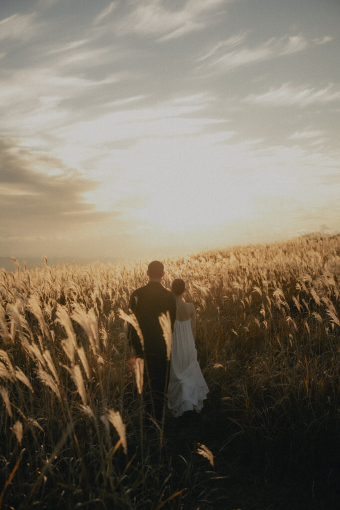 11月・和歌山の生石高原に広がる、秋のススキ野原。夕日がゆっくりと沈んでいく時間に合わせて撮影を行いました。一面に広がるやわらかな光と風に揺れるススキ。その中に佇むふたりの姿はまるで景色の一部のように自然に溶け込んでいきます。時間の移ろいとともに変化する光を感じながら、その一瞬一瞬をたいせつに切り取った秋のロケーション撮影となりました。