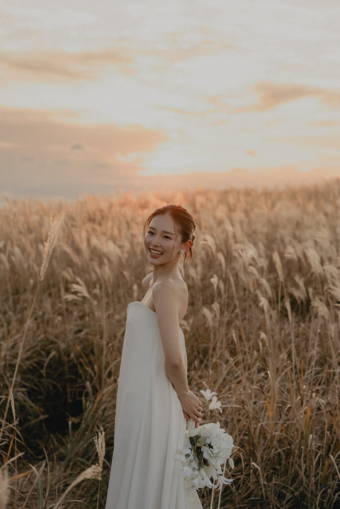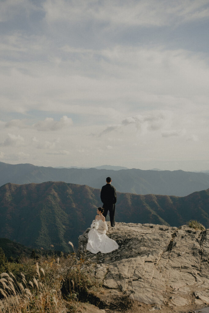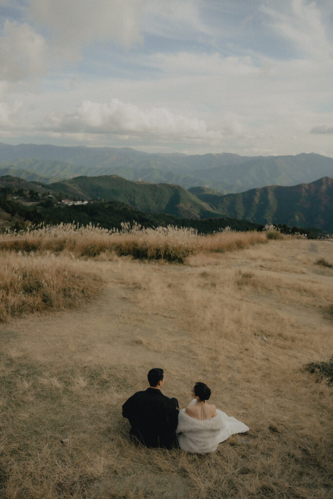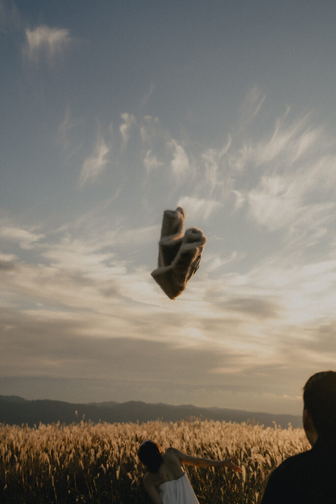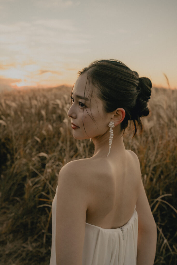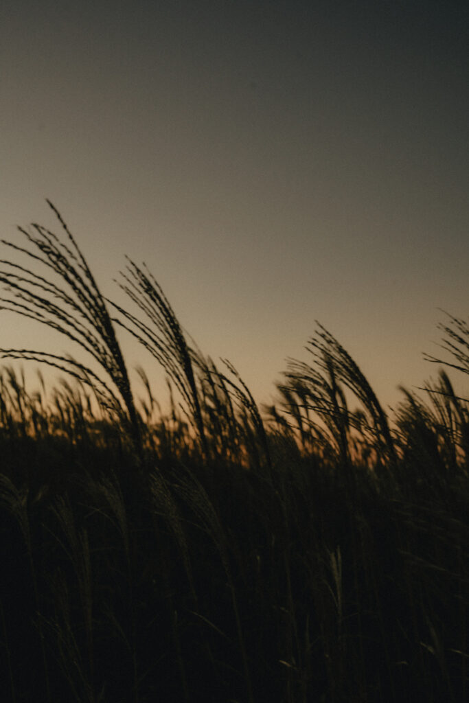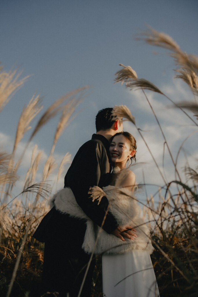11月・和歌山の生石高原に広がる、秋のススキ野原。夕日がゆっくりと沈んでいく時間に合わせて撮影を行いました。一面に広がるやわらかな光と風に揺れるススキ。その中に佇むふたりの姿はまるで景色の一部のように自然に溶け込んでいきます。時間の移ろいとともに変化する光を感じながら、その一瞬一瞬をたいせつに切り取った秋のロケーション撮影となりました。