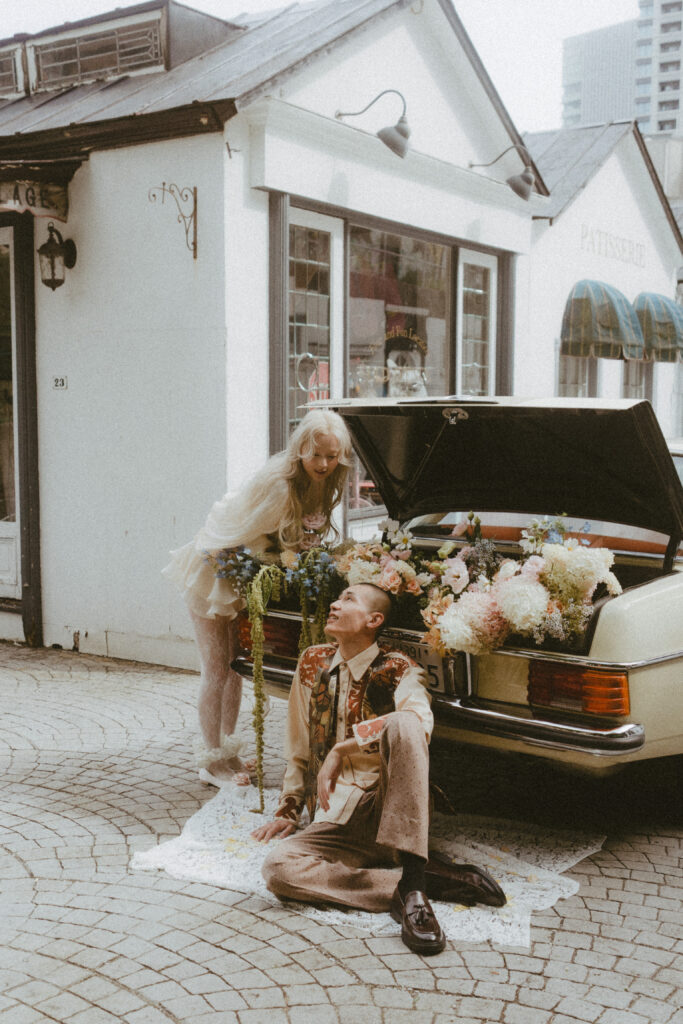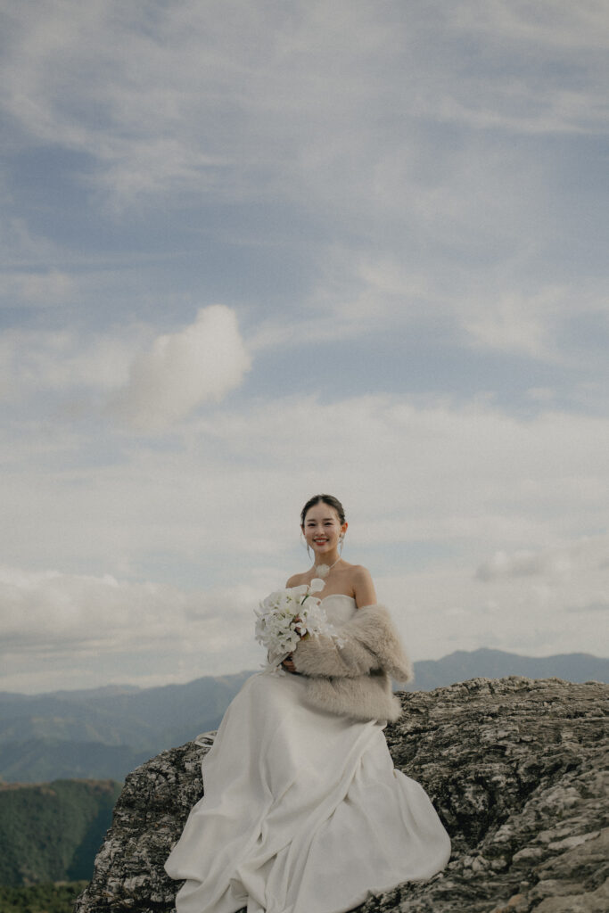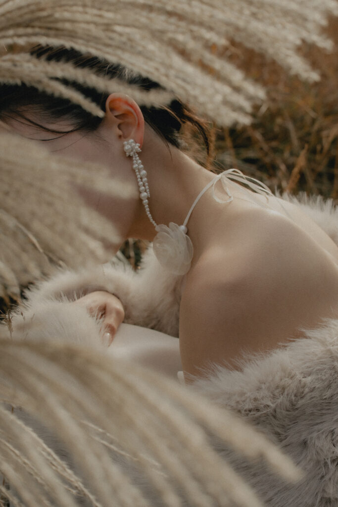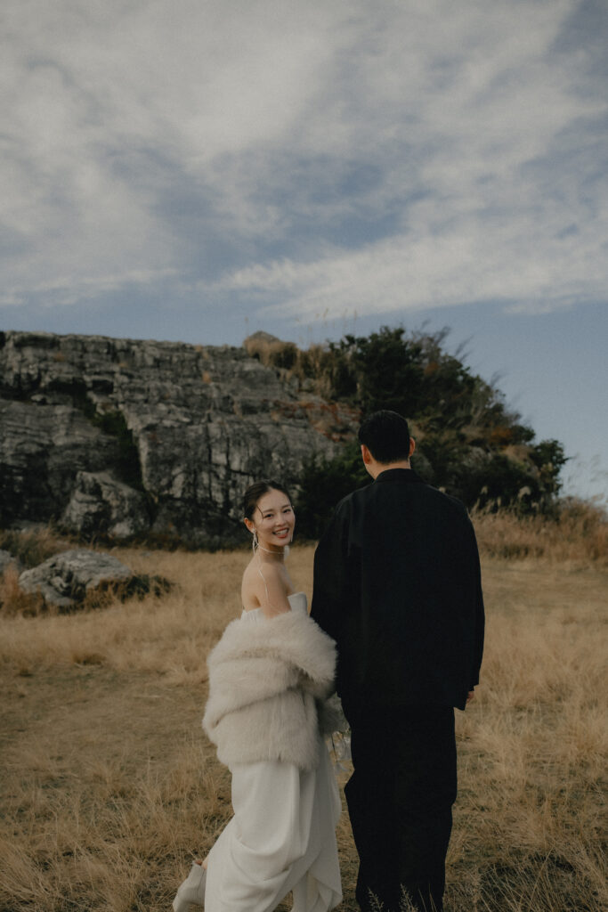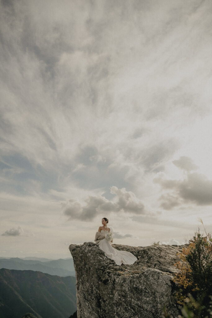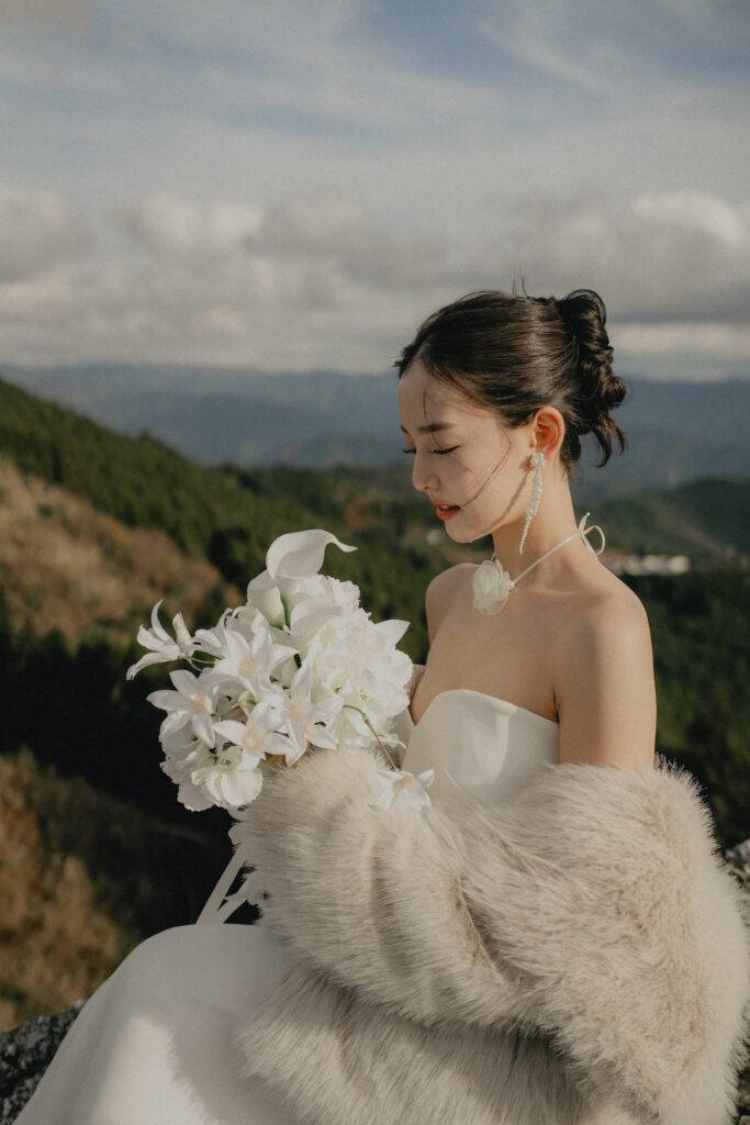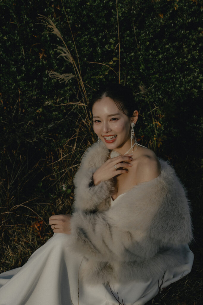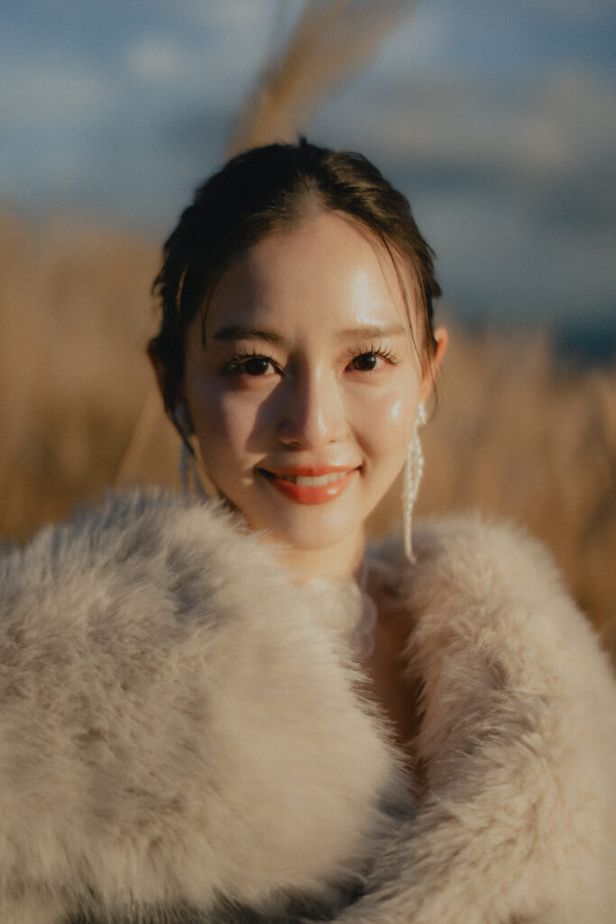 11月・和歌山の生石高原に広がる、秋のススキ野原。夕日がゆっくりと沈んでいく時間に合わせて撮影を行いました。一面に広がるやわらかな光と風に揺れるススキ。その中に佇むふたりの姿はまるで景色の一部のように自然に溶け込んでいきます。時間の移ろいとともに変化する光を感じながら、その一瞬一瞬をたいせつに切り取った秋のロケーション撮影となりました。