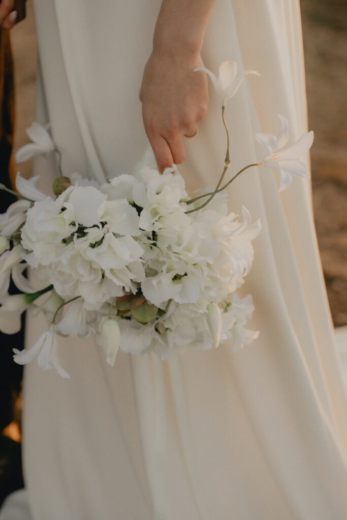 ホワイトを基調に、ほんのりグリーンを含んだナチュラルな色合いのブーケ。あえて整え過ぎず、少し歪さを残したフォルムにすることで、自然の中に溶け込むようなやわらかさを表現。軽やかに揺れる花々が、風や光と重なりあい、シンプルでありながらもイン印象に残る存在感を演出します。