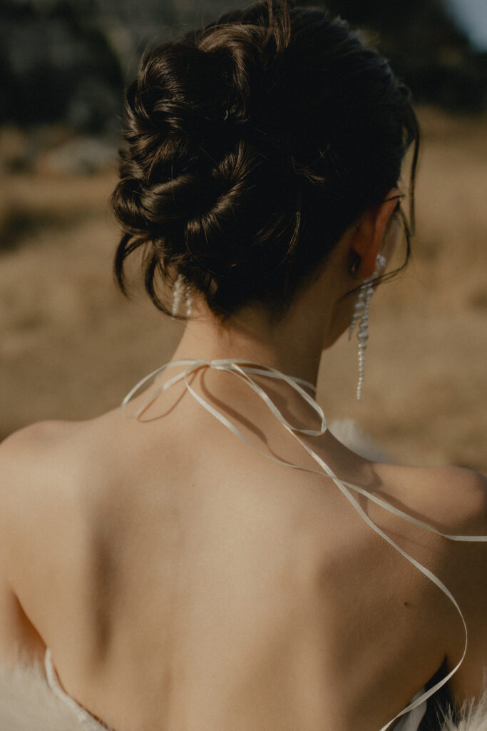 ヘアスタイルはタイトにまとめたシニヨンスタイルで首筋と背中のラインを美しく引き立てるバランスに。あえてきっちりまとめ過ぎず、顔周りにもやわらかく落ちる後れ毛を残すことで、風や光を感じる抜け感をプラス。