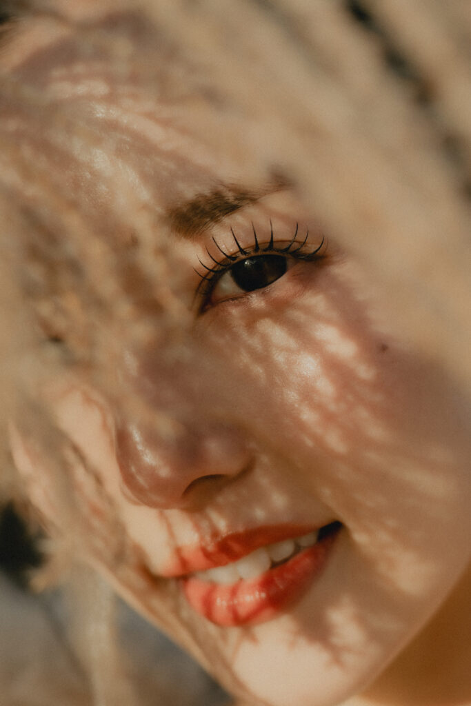 メイクは夕日の光に自然に溶け込む艶感をたいせつに。まつ毛はしっかりと束感を作り、肌はほんのり艶と血色を添えてやわらかく透明感のある印象に仕上げました。